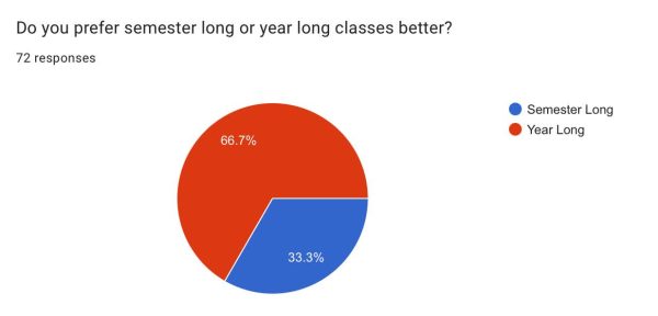 “I prefer year long courses because they provide stability with the base you gain from the beginning of the year is built upon all year, whereas semester long courses can feel rushed and it forces you to reset and get used to a new class at the start of the second semester,” said senior Akir Finley.
